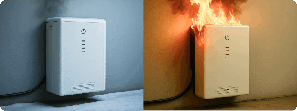 Magazyn energii w Twoim domu powinien być używany w warunkach jak najbardziej optymalnych. Chodzi tutaj o temperaturę, która nie powinna być zbyć wysoka ani zbyt niska. Najbardziej odpowiednia temperatura dla magazynów energii to 15–25°C. Jeżeli magazyn energii znajduję się w zbyt wysokiej temperaturze, która przekracza 35°C, czy zbyt niskiej temperaturze – poniżej 0°C, ogniwa niszczą się znacznie szybciej. Nieodpowiednia temperatura wpływa również na pojemność baterii.