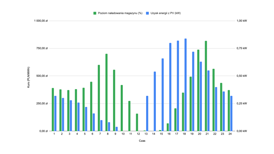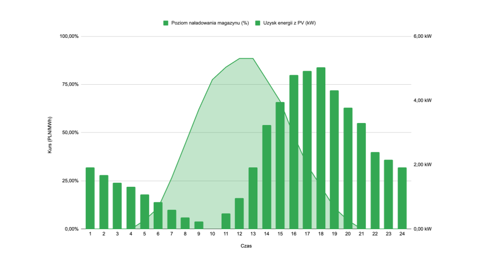 Analizowany wykres potwierdza te zależności. Słupki pokazujące poziom naładowania magazynu energii osiągają najwyższe wartości właśnie w porach, gdy ceny są wysokie. Tymczasem największa produkcja energii z instalacji fotowoltaicznej przypada na godziny od około 9:00 do 14:00, kiedy cena energii jest relatywnie niska. Sprzedaż nadwyżek w tym czasie w systemie net-billing jest mało opłacalna, ponieważ stawki są wtedy znacząco niższe niż w godzinach szczytowego zapotrzebowania.
