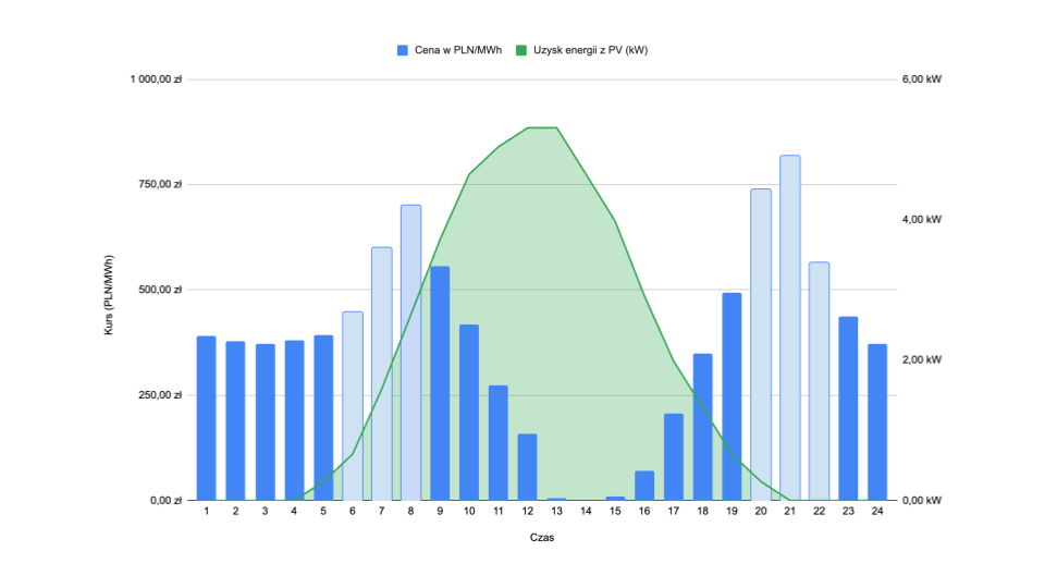 Na analizowanym wykresie wyraźnie widać, że największy uzysk energii z instalacji PV przypada na godziny 14:00–18:00. W tym czasie generowana moc z paneli fotowoltaicznych osiąga wartości bliskie 1 kW. Jednocześnie są to godziny, w których ceny energii na giełdzie są najniższe – poniżej 250 zł/MWh. Taka sytuacja sprawia, że sprzedaż tej energii w systemie net-billingu jest mało opłacalna, ponieważ zwrot finansowy za energię oddaną do sieci jest niewielki.